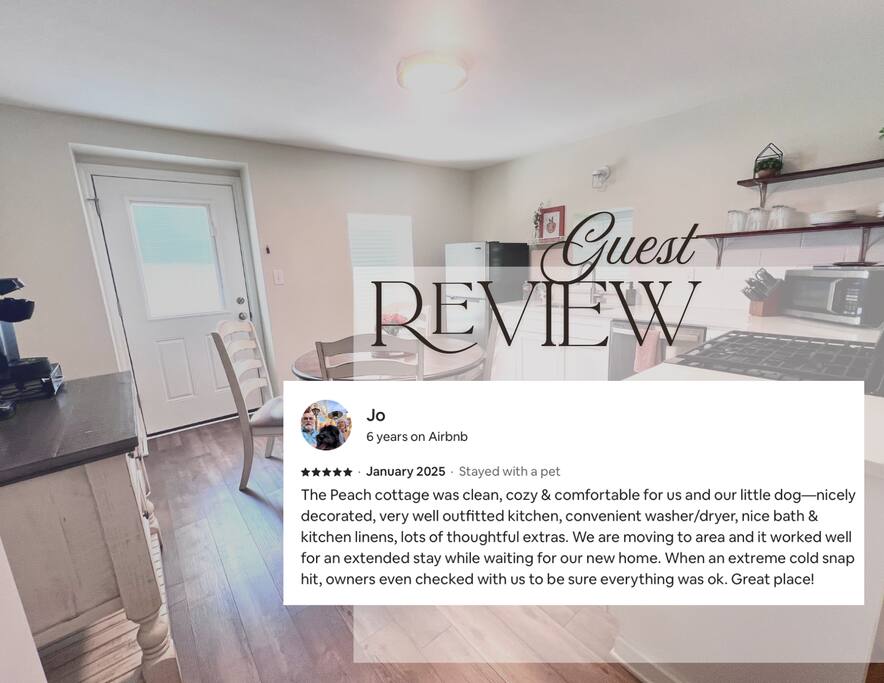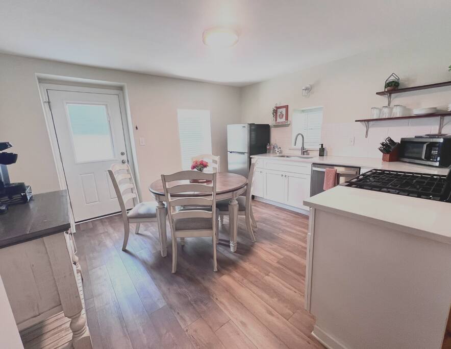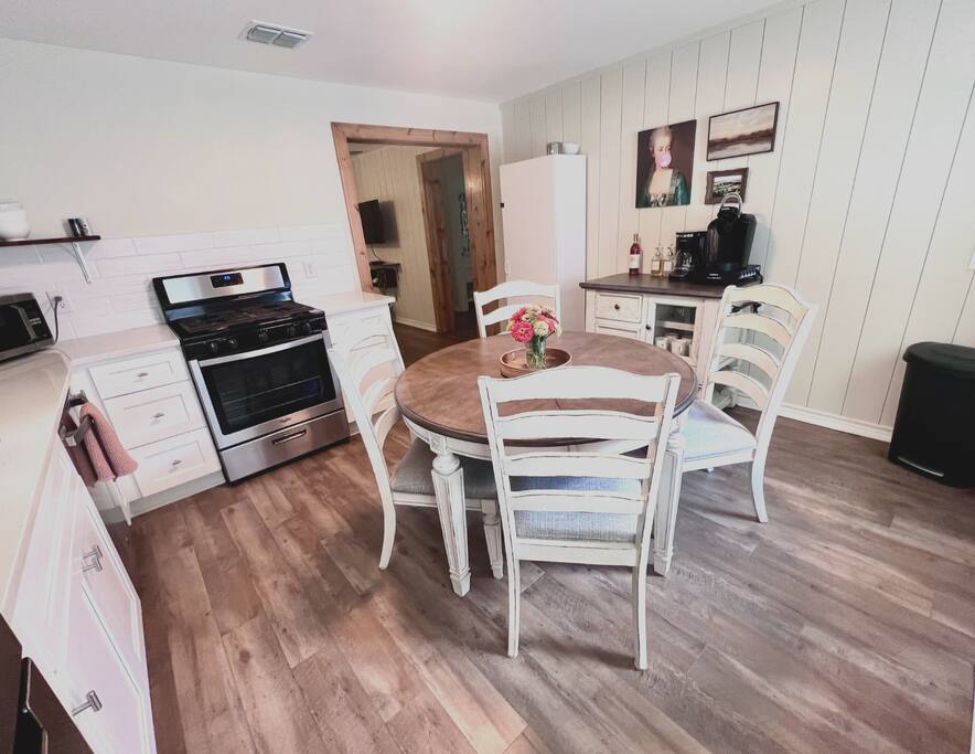 Every room of the Peach was remodeled in the summer of 2021. New paint, flooring, and furnishings work together to make the space feel light and airy. The kitchen is bright and the open shelving means less time spent on hunting for dishes. A Keurig coffee maker is provided. A starter stash of coffee, creamer, sugar, granola bars, waters, and many other amenities are provided! The gas cooktop makes cooking a snap. The patio is right out the back door and is equipped with a small table and chiminea. The patio leads the way to the laundry room where a stacked washer/dryer unit is waiting to get you back on top of laundry before heading home.